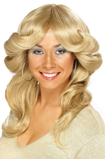 A blonde flick wig that is the epitome of the 1970’s with honey blonde flicks at the temple, hawling and cascading down to the shoulders in true Farrah Fawcett styling.