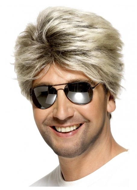 Classic 1980’s superstar short blonde streaked Wham wig with dark roots. One size fits all.