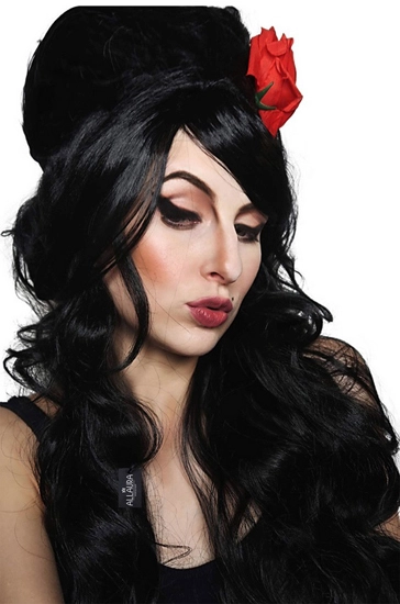 Fancy dress party wig of the irrepressible Amy Winehouse Rehab Babe high quality ‘Allaura brand’ teased beehive and dark brown/black curls tumbling down to the shoulders and back.