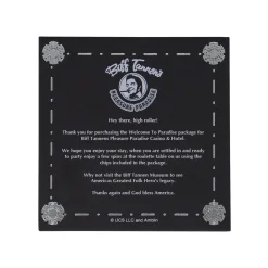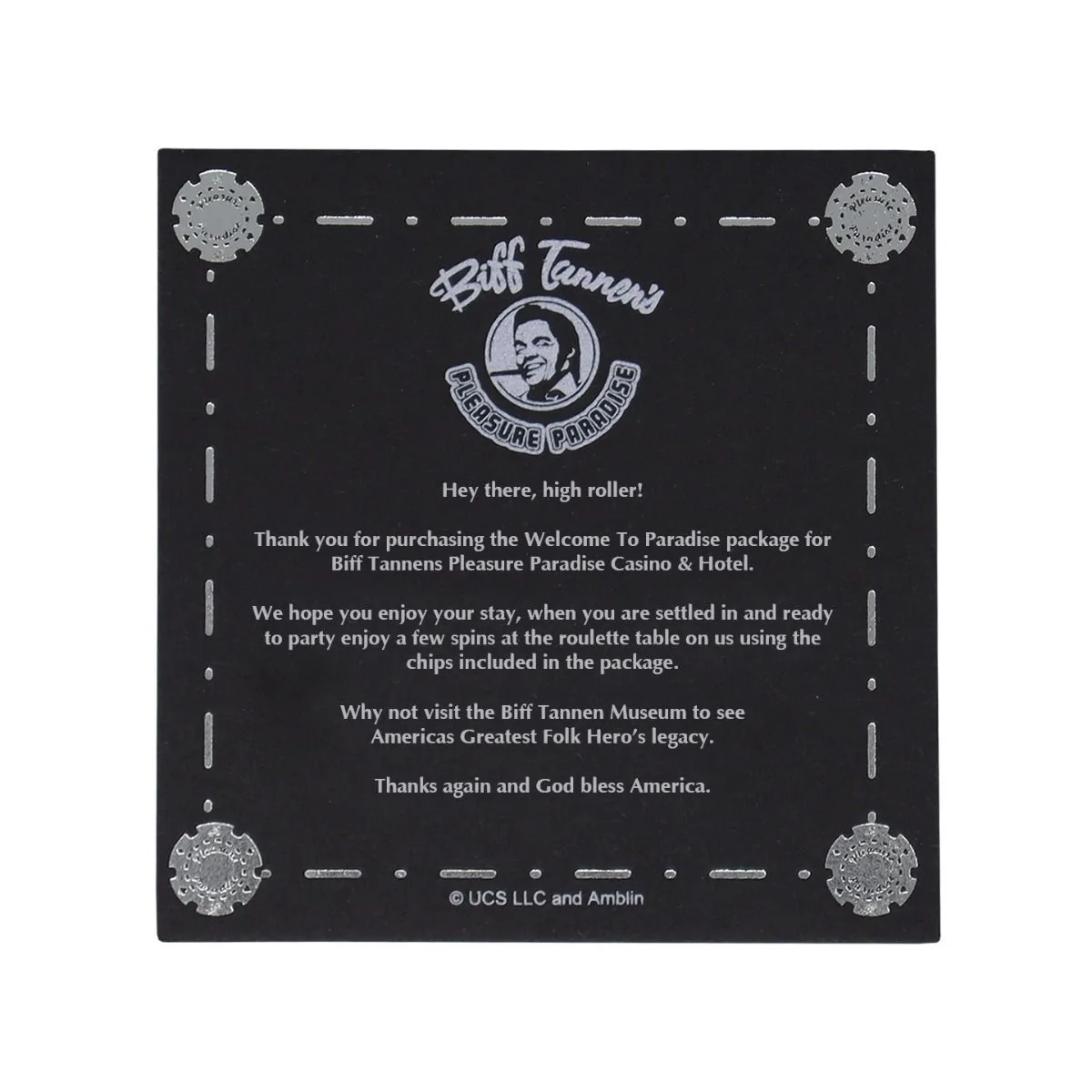 Welcome to the Pleasure Paradise Casino and Hotel. In-world collectible set containing a 24k gold plated poker chip, 24k gold plated pin badge and 24k gold plated ticket to the Biff Tannen museum as well as a welcome note from the Casino. Limited to 1985 worldwide.