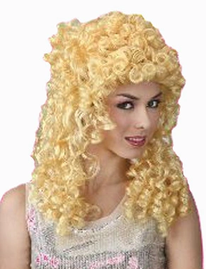 A dress up party wig in cascades of blonde permed curls that are shoulder length