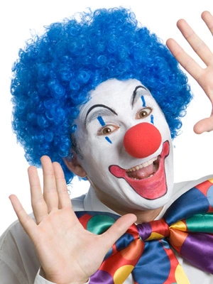 A curly clown wig in blue for fancy dress parties – nose not included but can be bought separately
