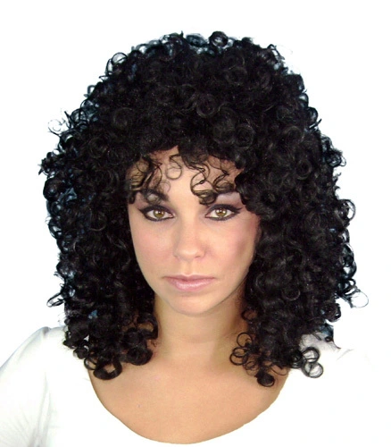 A luscious looking long, black & curly perm Cher type wig for fancy dress up occasions.