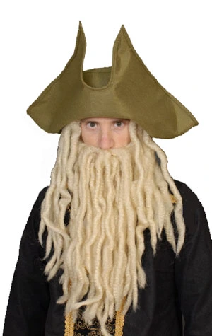 A Davey Jones fancy dress party wig and hat. Seaweed green Captain’s hat with dreadlock like long blonde tassles. Great for a Pirates of the Caribbean type party.
