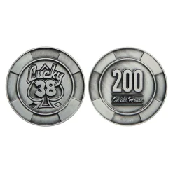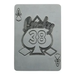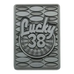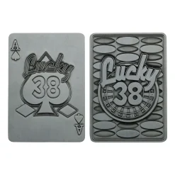 Embrace the post-apocalyptic casino from Fallout New Vegas with this metal casino set. Presentation box includes a metal ace of spades card, poker chip and pin badge all with heavily embossed detailing and a display stand included.
