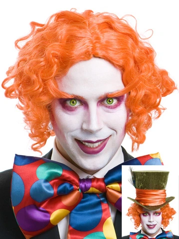 A fancy dress party wig in bright orange for Mad Hatter look and has the matching flyaway eyebrows to really look the part for Alice in Wonderland parties.