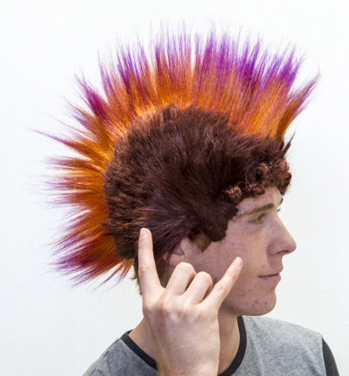 A really colourful purple, orange & brown mohawk style punk wig. One size fits most.