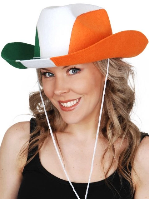 A fabulous St Patrick’s day themed cowboy hat in green, orange and white. Made of feltex this St Patrick’s Day fancy dress hat will be sure to impress. One size fits all.