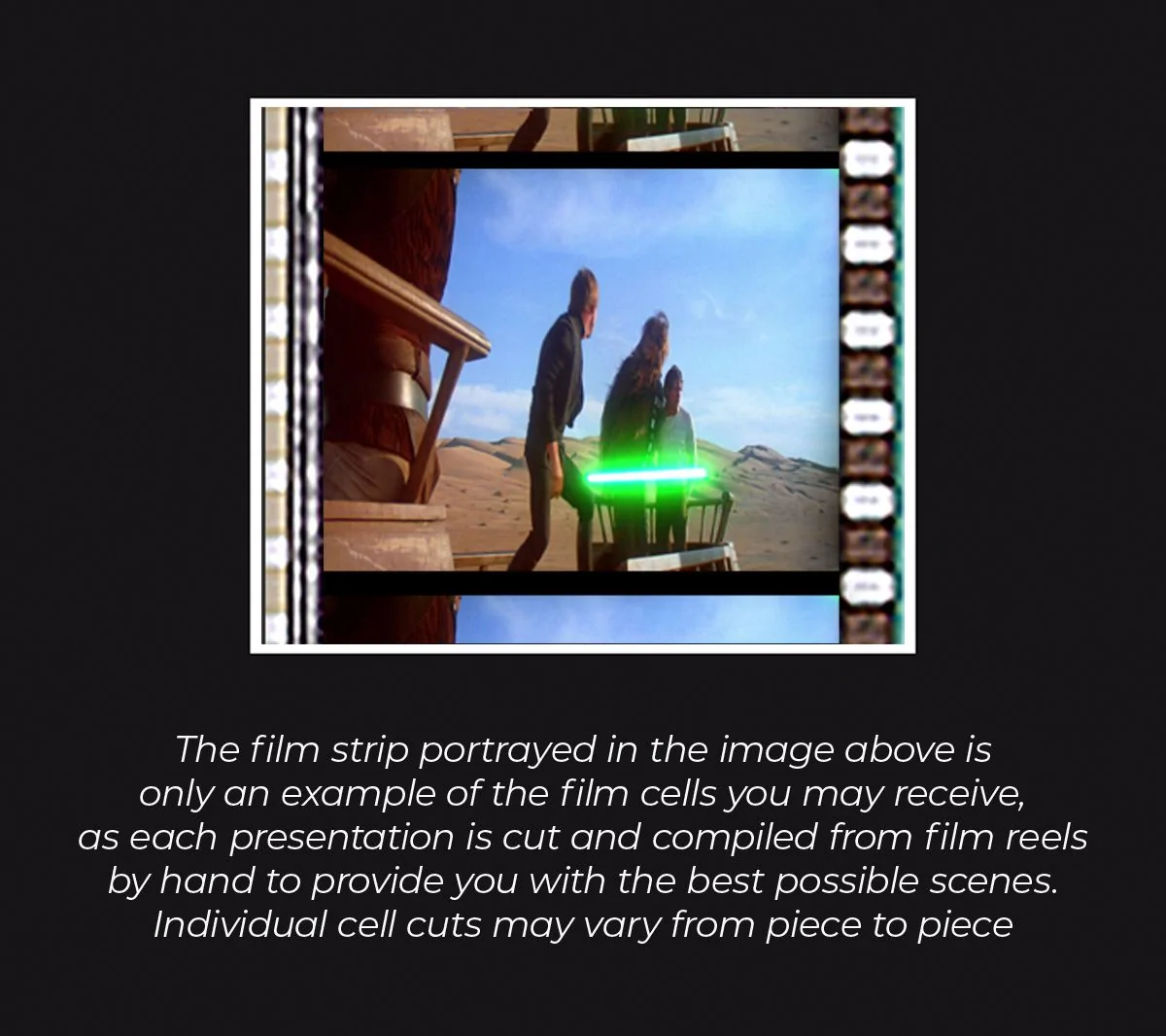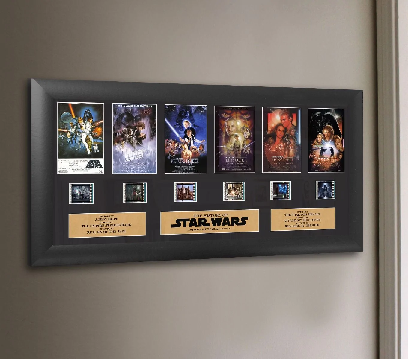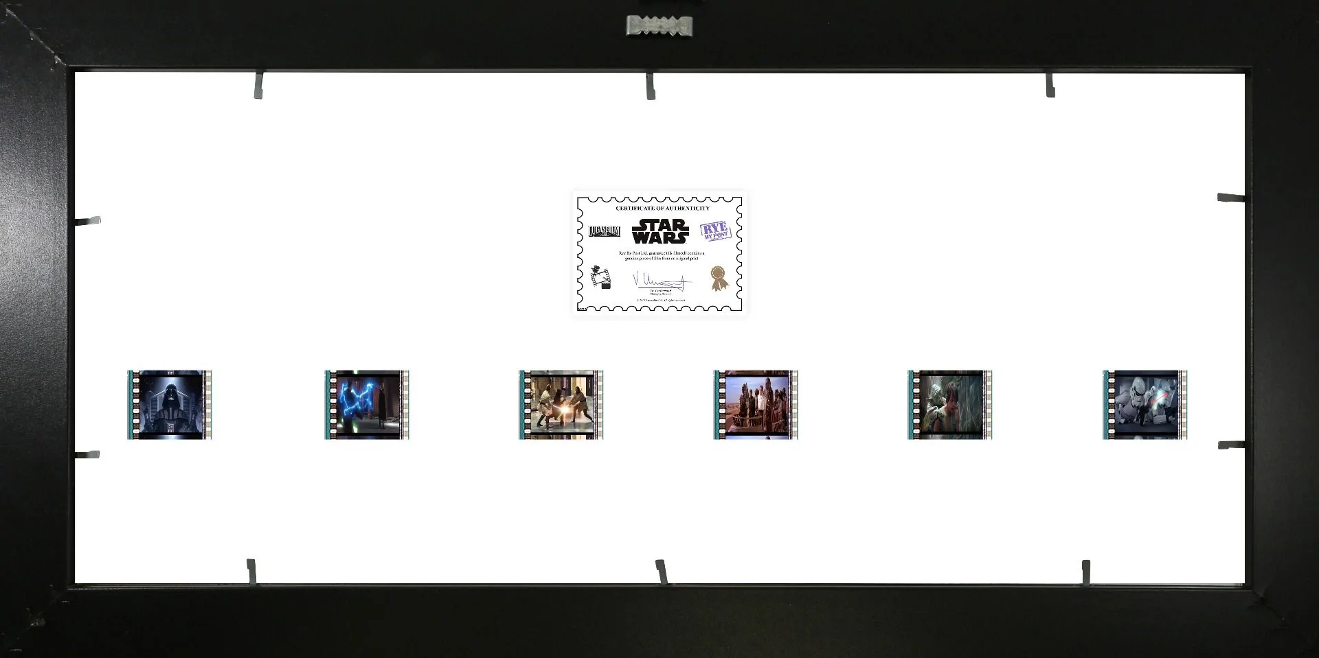 Features 6x 35mm clips of REAL MOVIE FILM showing a scene from each movie, Episode 1 (The Phantom Menace) through Episode 6 (Return of the Jedi)