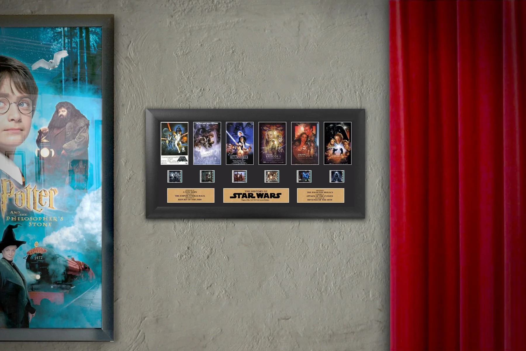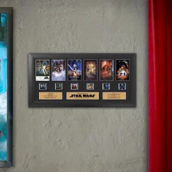 The first six Star Wars films are immortalized in this FilmCells presentation. This framed collectible features the film posters of the first six films, a certificate of authenticity, and six clips of real 35mm film from the Star Wars saga. Each officially licensed FilmCells presentation is made with careful attention to detail. It is double matted, placed in a quality frame, and contains an acrylic front and back allows natural light to enhance the film frames. This is all put together to bring you a collectible that looks great in any room. Each piece of film is hand-cut from reels to provide you with the best possible scenes to offer a unique and varied product. The film strip portrayed in the image above is only an example of the film cells you may receive. Please note, the cells may vary from piece to piece as they are hand selected from reels of film.